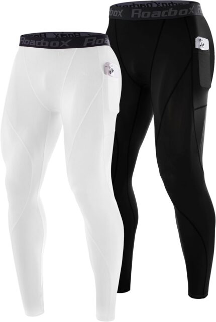 Roadbox 1 or 2 Pack Compression Pants Men, Running Workout Leggings with Pockets, Gym Basketball Athletic Tights Base Layer